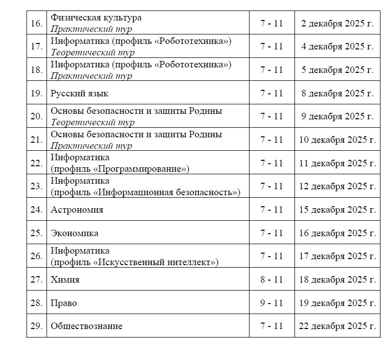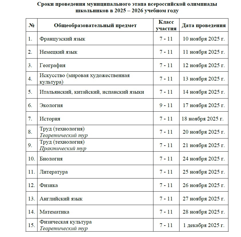 Муниципальный этап всероссийской олимпиады школьников в 2025-2026 учебном году будет проходить в период с 12.11.2025г. по 22.12.2025г. в очной форме на базе муниципальных общеобразовательных организаций города.